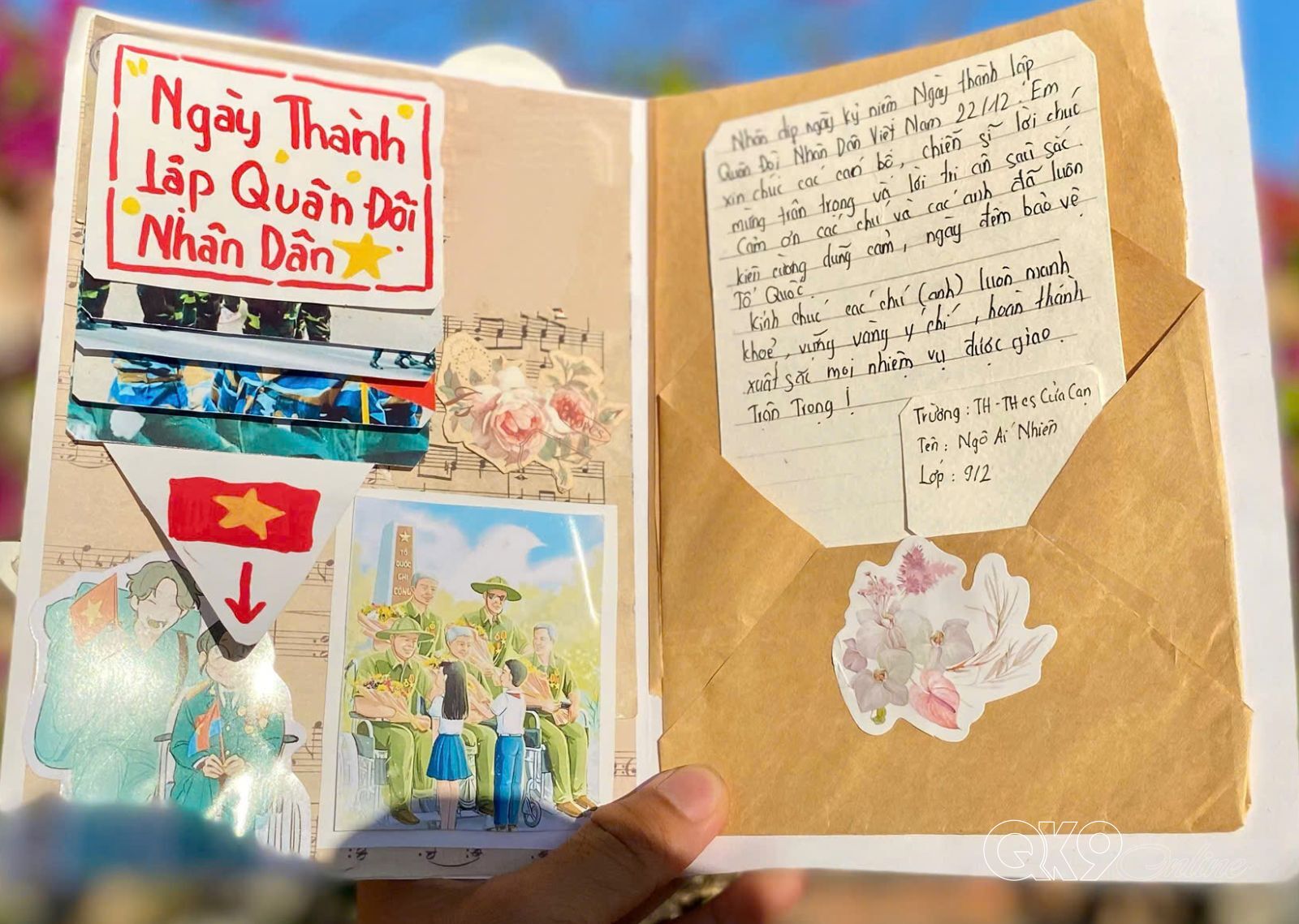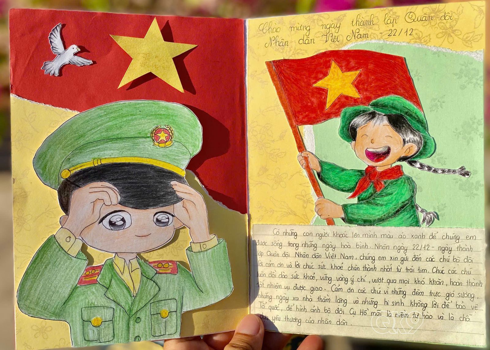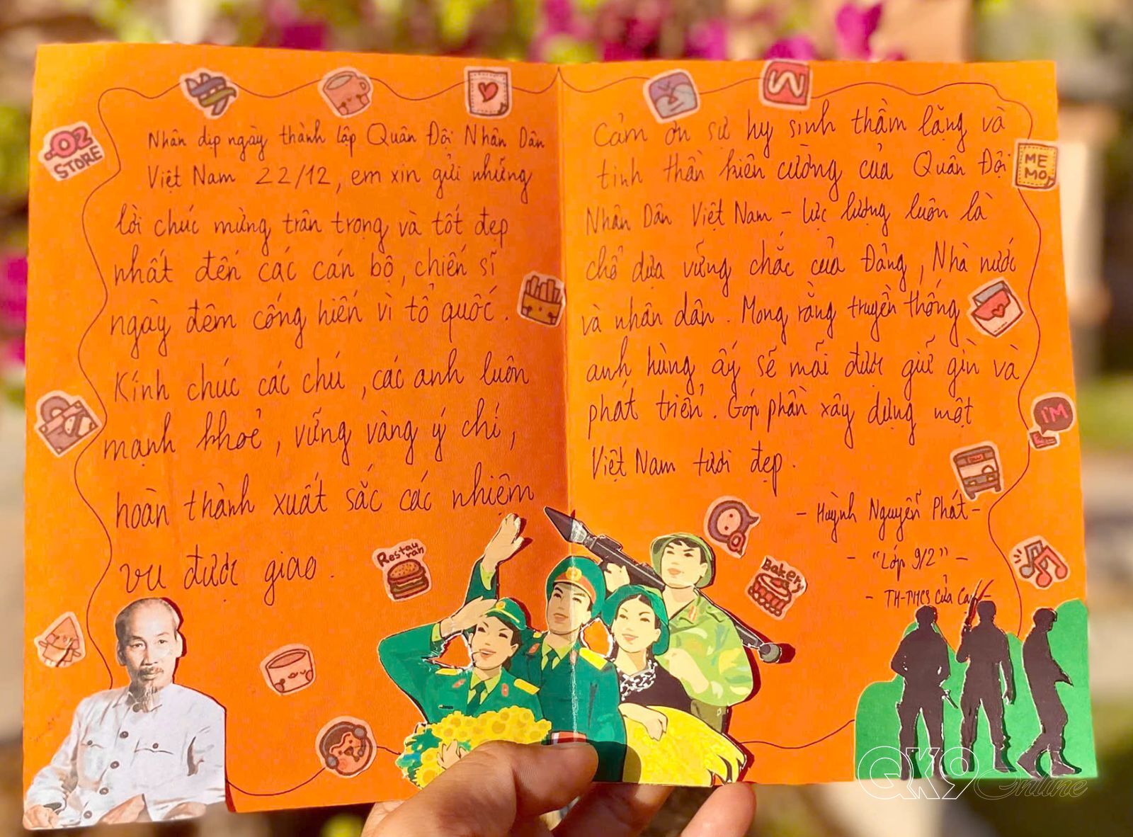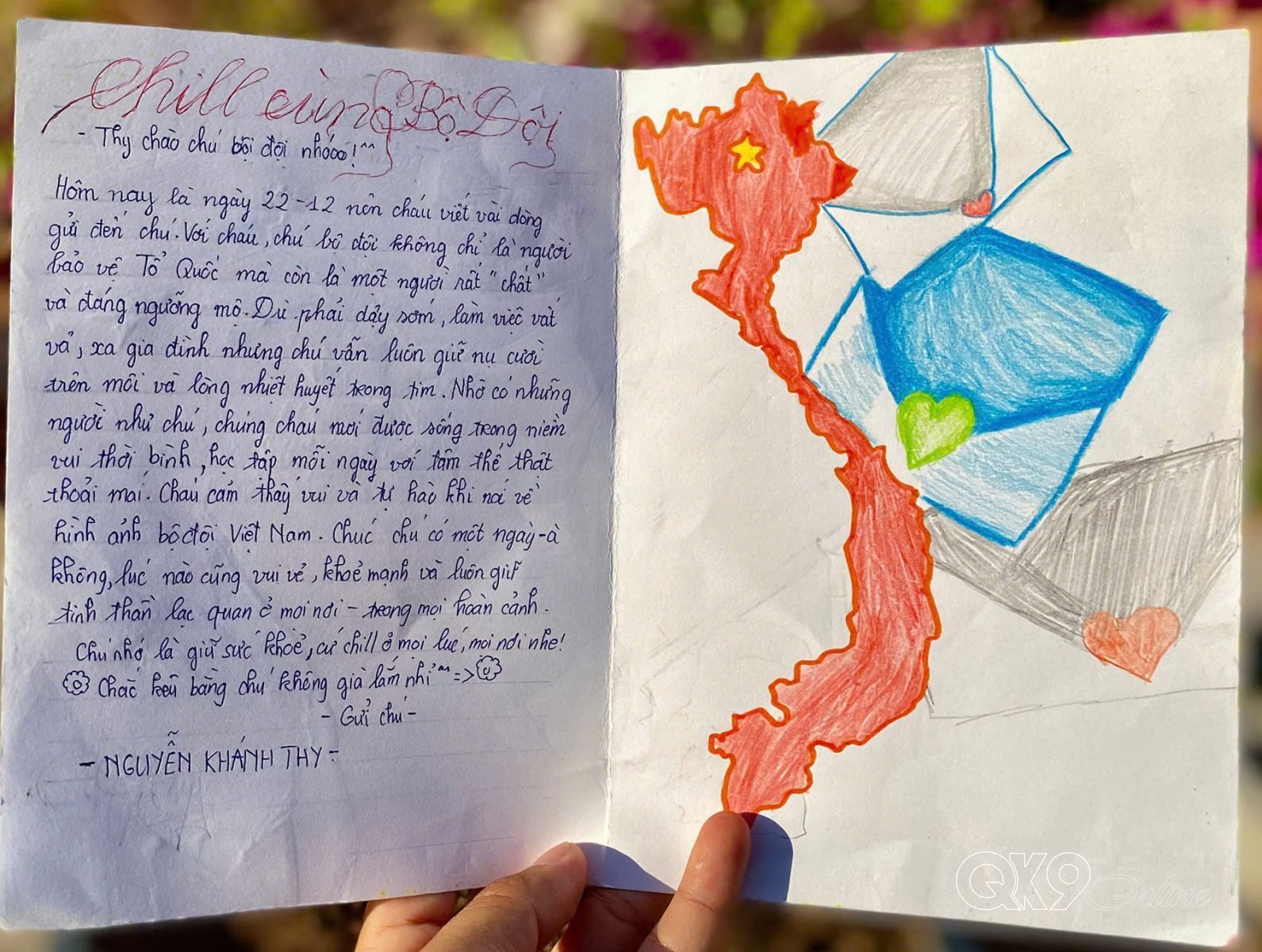 Hôm nay là ngày 22/12 nên cháu viết vài dòng gửi đến chú. Với cháu, chú bộ đội không chỉ là người bảo vệ Tổ quốc mà còn là một người rất “chất” và đáng ngưỡng mộ. Dù phải dậy sớm, làm việc vất vả, xa gia đình nhưng chú vẫn luôn giữ nụ cười trên môi và lòng nhiệt huyết trong tim. Nhờ có những người như chú, chúng cháu mới được sống trong niềm vui hòa bình, học tập mỗi ngày với tâm thế thật thoải mái. Cháu cảm thấy vui và tự hào khi nói về hình ảnh bộ đội Việt Nam. Chúc chú có một ngày - à không, lúc nào cũng vui vẻ, khỏe mạnh và luôn giữ tinh thần lạc quan ở mọi nơi, trong mọi hoàn cảnh. Chú nhớ giữ gìn sức khỏe, cứ chill ở mọi lúc, mọi nơi nhe”.