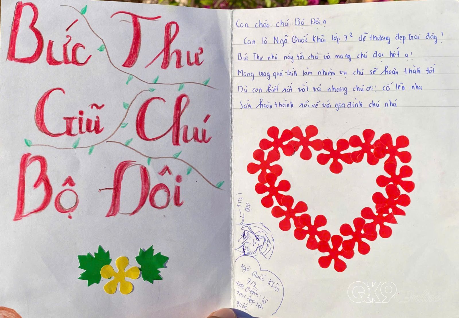 Bức thư nhỏ này tới chú và mong chú đọc hết ạ! Mong trong quá trình làm nhiệm vụ chú sẽ hoàn thành tốt. Dù con biết rất vất vả nhưng chú ơi! Cố lên nha. Sớm hoàn thành rồi về với gia đình chú nhá”.