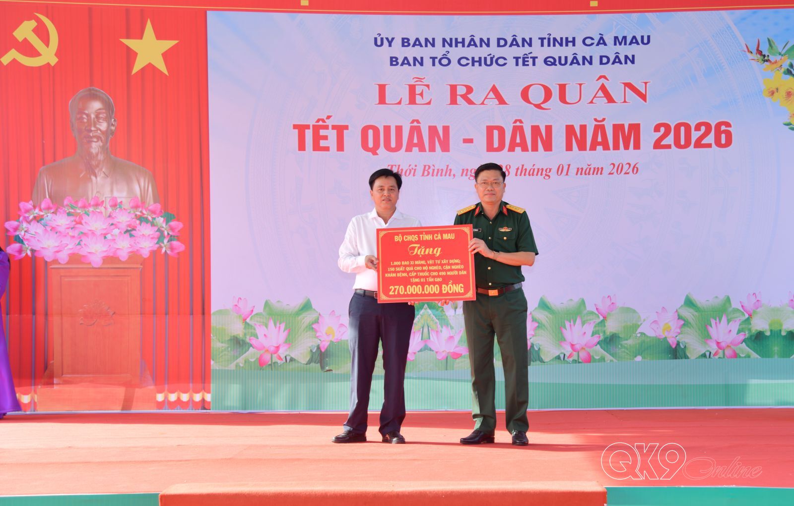 Phát biểu tại buổi lễ, đồng chí Ngô Vũ Thăng, Phó Chủ tịch UBND tỉnh, Phó Trưởng Ban Chỉ đạo Tết Quân – Dân năm 2026 cho biết, chương trình đã thu hút 64 cơ quan, đơn vị, tổ chức, cá nhân và doanh nghiệp đăng ký tham gia với nhiều công trình, phần việc ý nghĩa như: xây dựng đường giao thông, cầu bê tông, hệ thống chiếu sáng nông thôn; xây tặng nhà cho các đối tượng khó khăn; trao quà, xe đạp, học bổng cho học sinh; tặng bảo hiểm y tế; tổ chức khám bệnh, cấp thuốc miễn phí; chuyến hàng lưu động về nông thôn; gian hàng quần áo 0 đồng và gói bánh tét phục vụ Tết./.