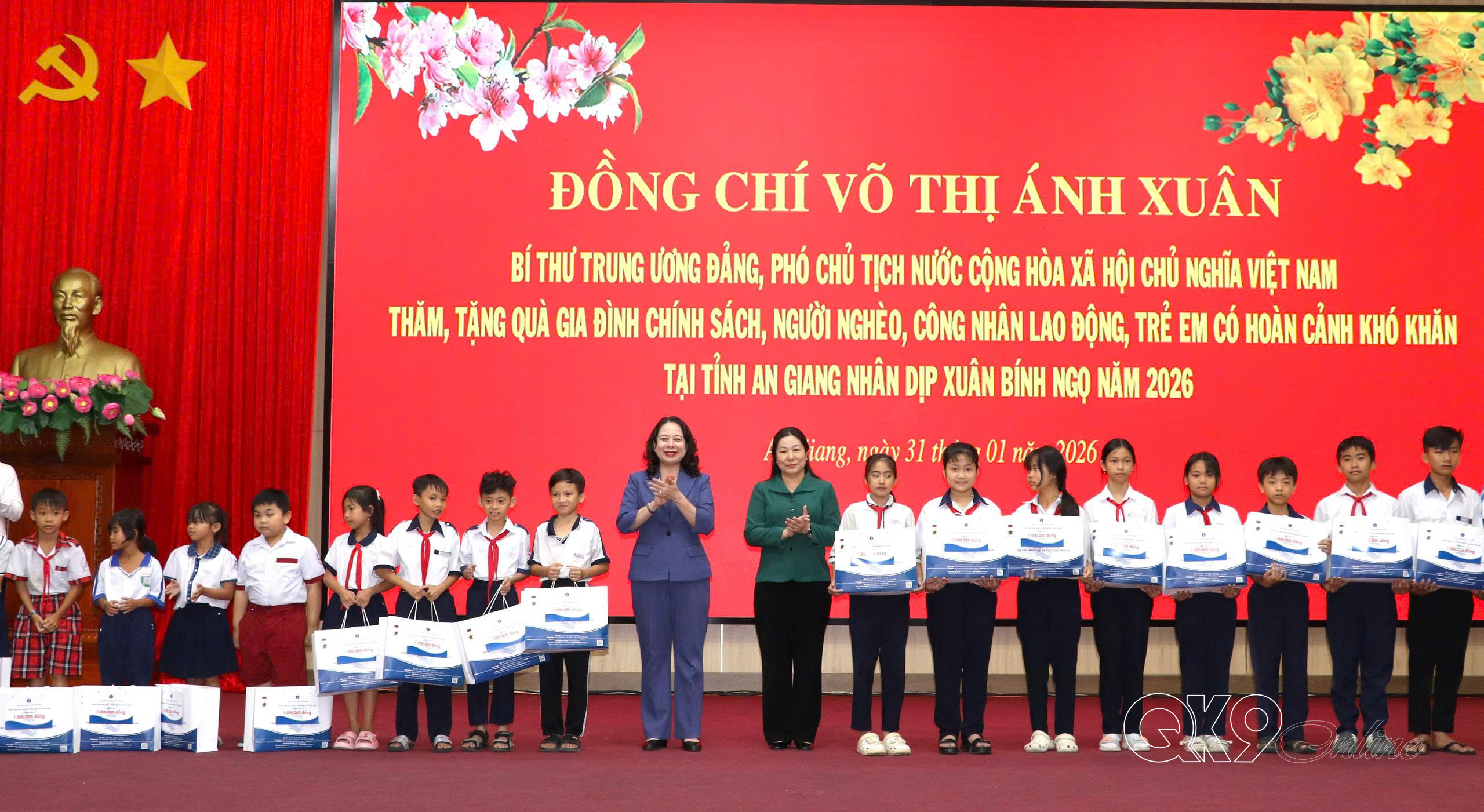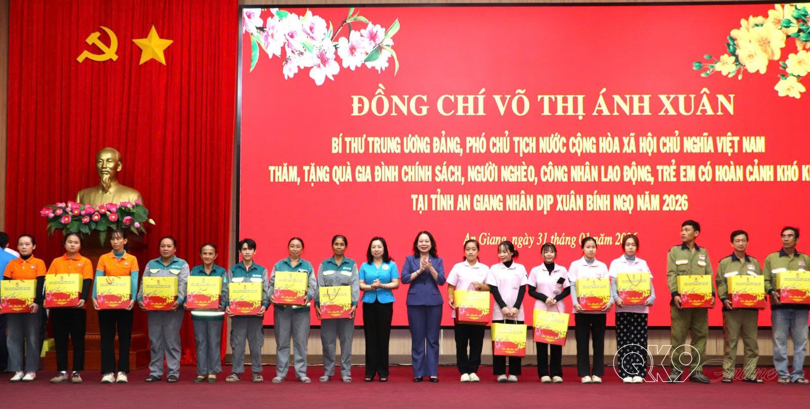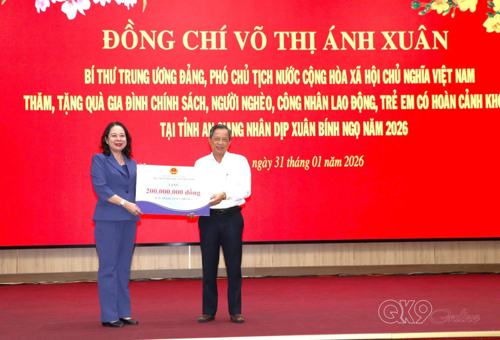 Nhân dịp năm mới Xuân Bính Ngọ 2026, thay mặt lãnh đạo Đảng, Nhà nước, Phó Chủ tịch nước Võ Thị Ánh Xuân chúc bà con nhân dân tỉnh An Giang nhiều sức khỏe, hạnh phúc và thành công. Đồng thời, đề nghị tỉnh An Giang tiếp tục quan tâm chăm lo các đối tượng chính sách, người nghèo, người khó khăn, yếu thế, công nhân, người lao động...; bảo đảm an ninh, an toàn, an dân để người dân đón Tết vui tươi, đầm ấm, an toàn, tiết kiệm…