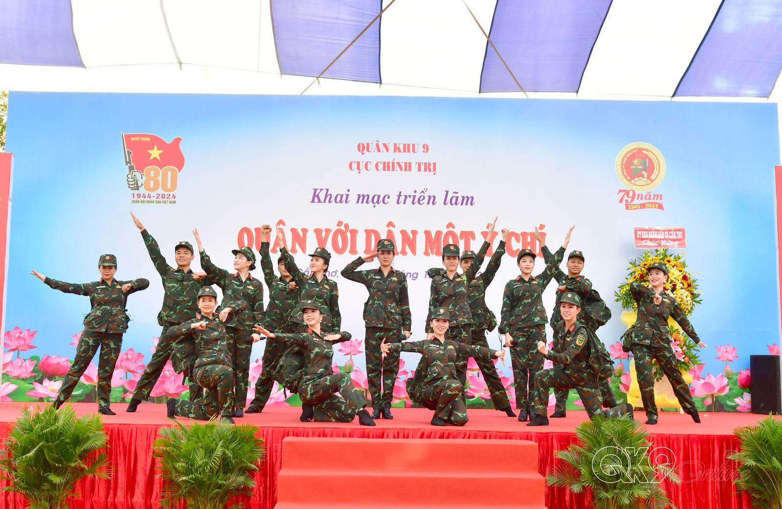 Đoàn văn công Quân khu biểu diễn các tiết mục văn nghệ chào mừng triển lãm.