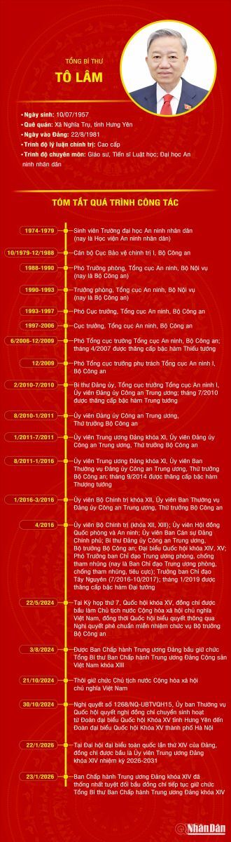 - Sáng 23/1, tại Hội nghị lần thứ nhất, Ban Chấp hành Trung ương Đảng khóa XIV đã thống nhất tuyệt đối bầu đồng chí Tô Lâm, Tổng Bí thư Ban Chấp hành Trung ương Đảng khóa XIII tiếp tục giữ chức Tổng Bí thư Ban Chấp hành Trung ương Đảng khóa XIV.