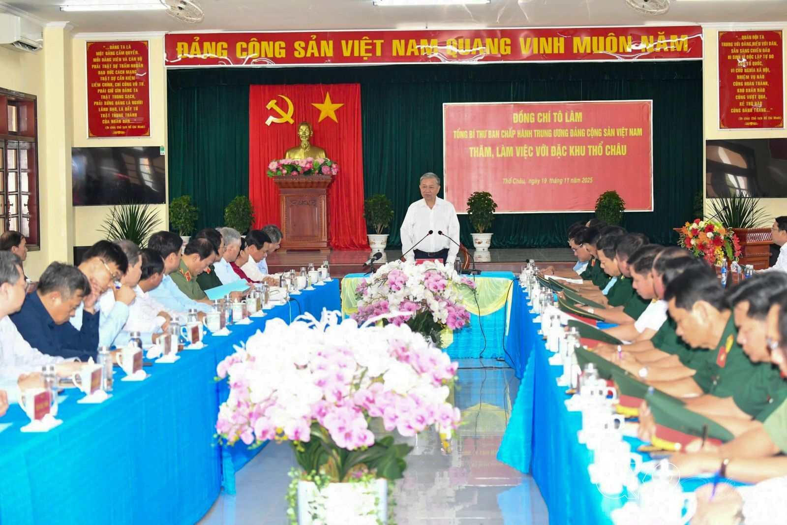Tại Đặc khu Thổ Châu: Tổng Bí thư Tô Lâm chia sẻ với những khó khăn của của Nhân dân trên đảo khi đối mặt với nhiều khó khăn, thách thức nhưng Nhân dân và cán bộ, chiến sĩ đoàn kết một lòng, ngày đêm bám biển, bám đảo bảo vệ vững chắc chủ quyền thiêng liêng của Tổ quốc. Đồng chí Tổng Bí thư nhấn mạnh: “Tôi mong muốn toàn thể Đảng bộ, chính quyền, chiến sĩ và Nhân dân Đặc khu Thổ Châu chung một lòng dựng xây một Thổ Châu mới, kinh tế vững vàng, sinh thái bền vững, quốc phòng kiên cố, an ninh bền vững, một Thổ Châu tương lai mà mỗi người dân cả nước đều muốn đặt chân tới, để tự hào, để tin yêu, để cảm nhận hơi thở của Tổ quốc nơi cuối trời Tây Nam; để nơi đây trở thành một đặc khu biên đảo xanh - mạnh - bền vững”.