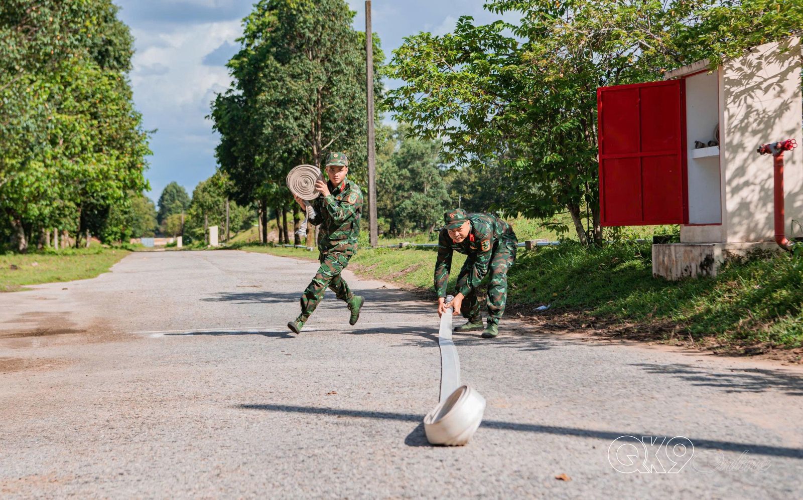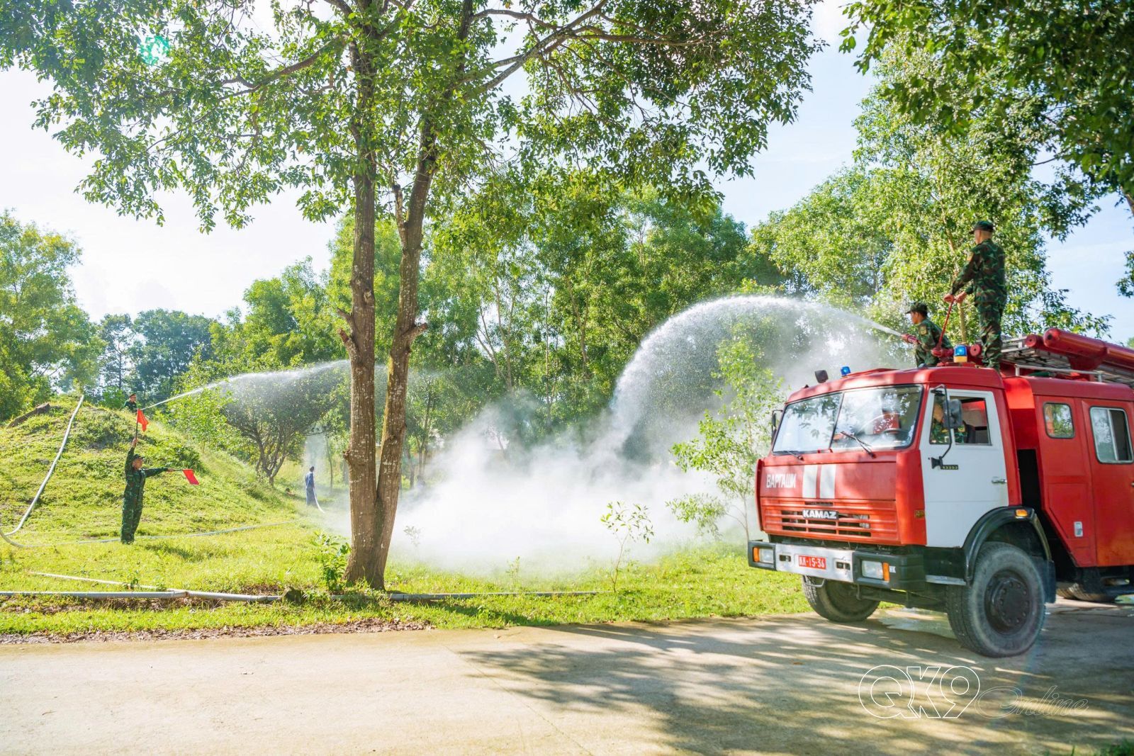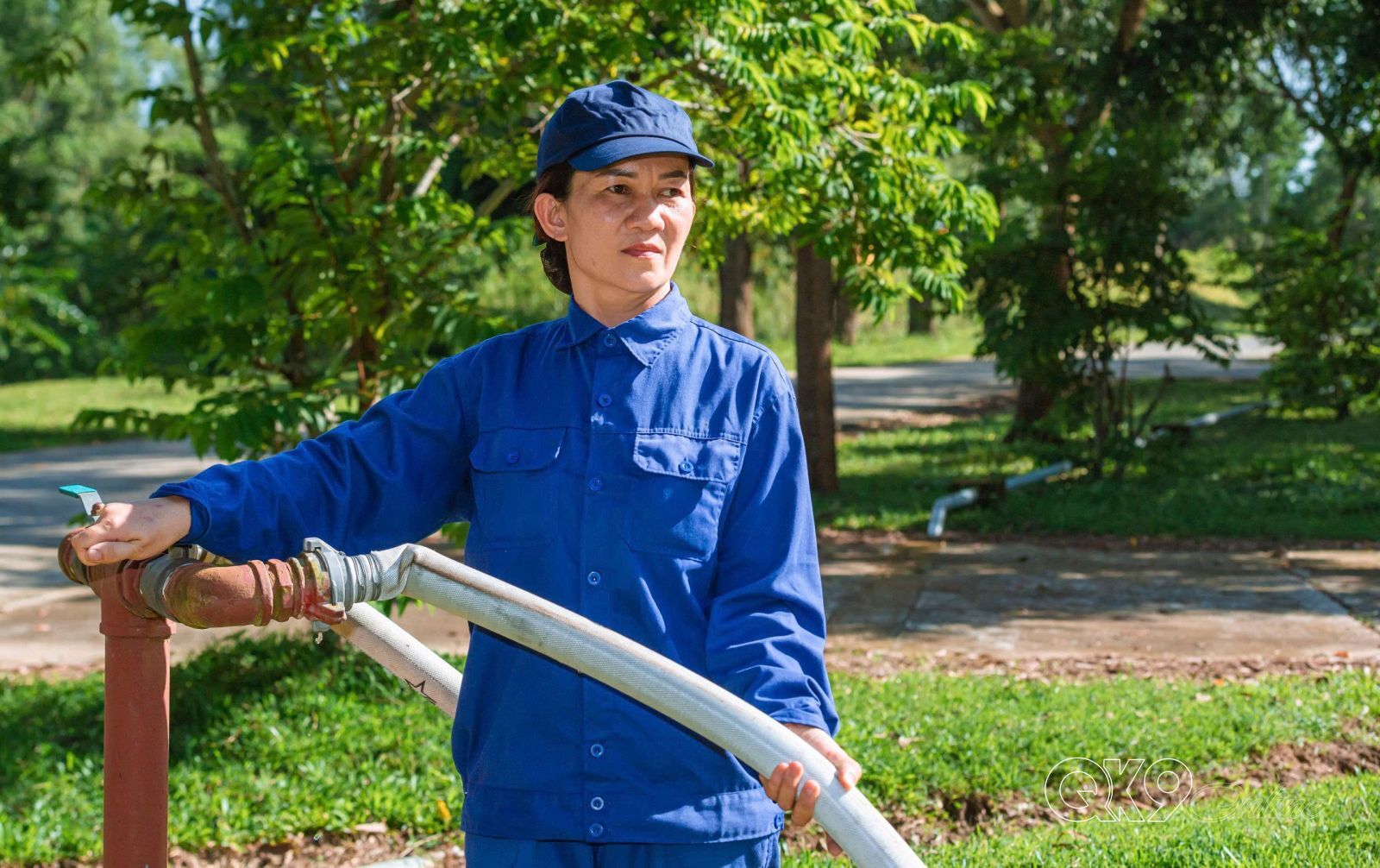 Thiếu tá Lê Thị Minh, Thủ kho vật tư, Đội Bảo quản mở van điều chỉnh áp lực bảo đảm nước phun đều, ổn định.