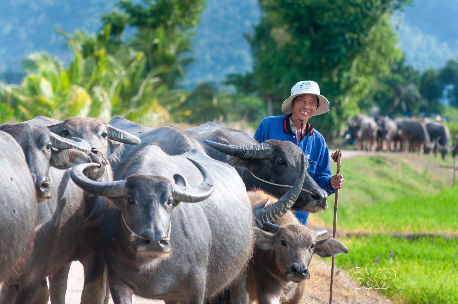 Chú Hai Sang cẩn thận dẫn đàn trâu đi đúng vùng cỏ tự nhiên, tránh xa các ruộng lúa.