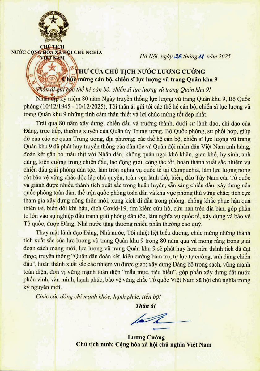 Nhân dịp kỷ niệm 80 năm Ngày truyền thống lực lượng vũ trang Quân khu 9, Bộ Quốc phòng (10/12/1945 - 10/12/2025), Tôi thân ái gửi tới các thế hệ cán bộ, chiến sĩ lực lượng vũ trang Quân khu 9 những tình cảm thân thiết và lời chúc mừng tốt đẹp nhất.