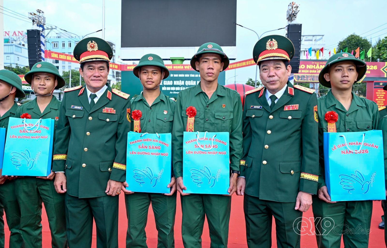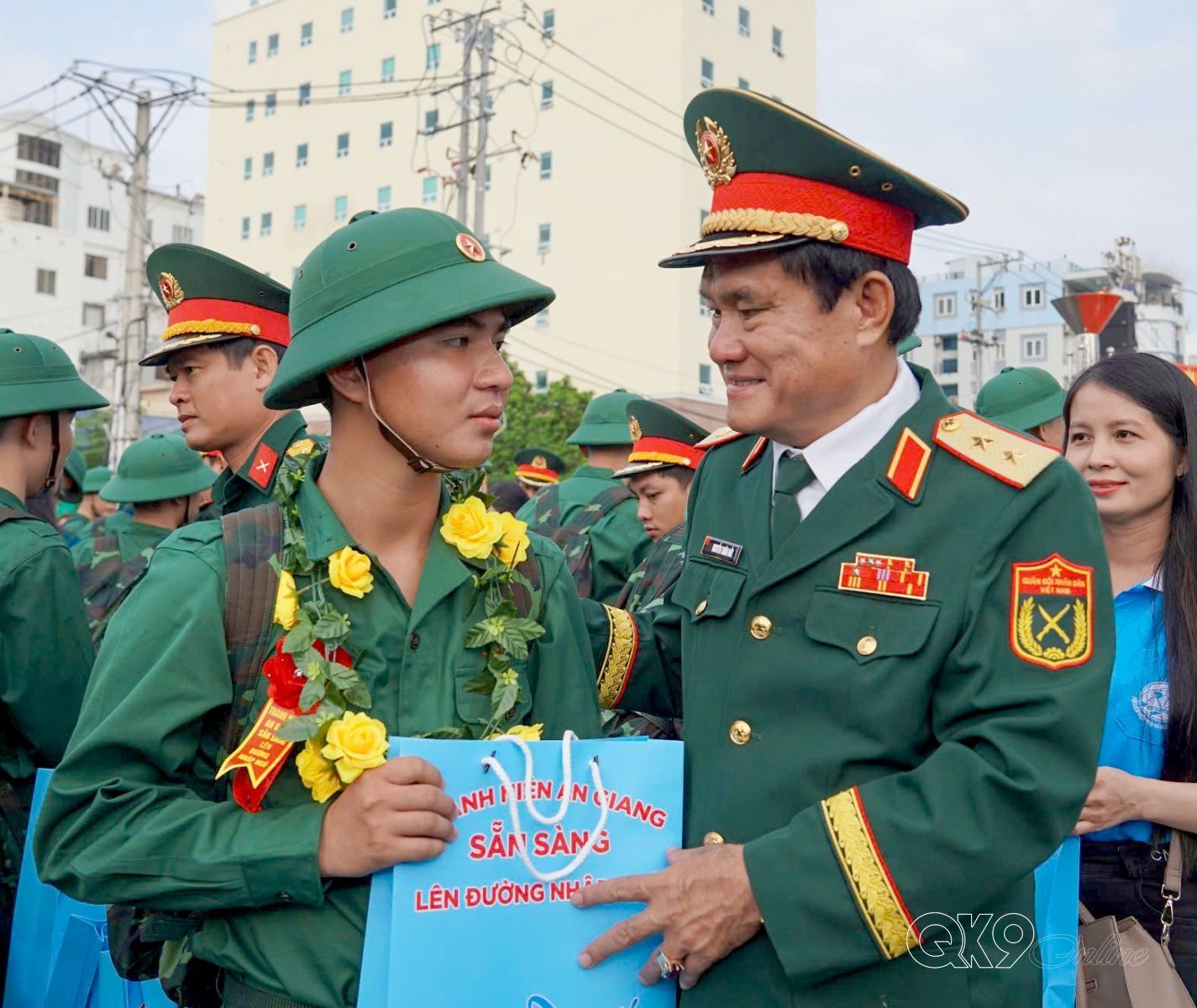 Thượng tướng Nguyễn Văn Gấu, Ủy viên BCH Trung ương Đảng, Ủy viên Quân ủy Trung ương, Thứ trưởng Bộ Quốc phòng tặng quà, động viên thanh niên tỉnh An Giang lên đường nhập ngũ.