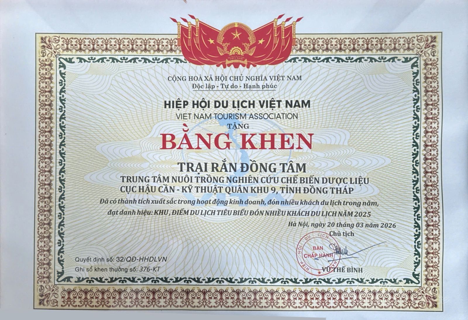 Việc được Hiệp hội Du lịch Việt Nam ghi nhận, khen thưởng không chỉ là sự động viên to lớn mà còn là minh chứng cho những nỗ lực bền bỉ của đơn vị trong thời gian qua. Đây cũng là động lực để Trại rắn Đồng Tâm tiếp tục phát huy thế mạnh, nâng cao chất lượng phục vụ, xứng đáng là một trong những điểm đến tiêu biểu của khu vực Đồng bằng sông Cửu Long./.
